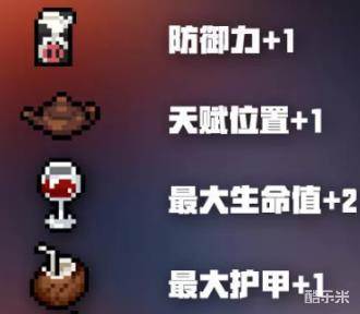 椰子汁是一种比较常见的饮料,相比其他的饮料出现的几率比较高。效果也比较一般,增加1个最大护甲。这个效果和天赋护盾加1一模一样。如果遇到了有钱就喝吧!毕竟花个几十金币购买一个天赋还是值得的。特别是对一些护盾比较少的人物,比如游侠,一样能够带来不小的提升。