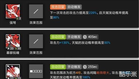 这是r7的技能数据,被动的概率触发使她不开技能时输出非常不稳定,实际测试下来,平均秒伤(对0甲)远低于同阶的能天使,手短的毛病更是严重,但是我们依然可以看到其培养的潜力。