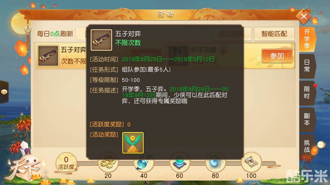 《天下》手游初秋开学季欢乐活动“五子对弈”8月29日欢乐开场至9月12日!活动期间少侠可以不限次数的叫上至多4位亲朋好友一起组队参加,并且在你尽情享受五子棋给你带来的无限乐趣时,一份神秘专属奖励也已经安排上啦。快来一探究竟吧!