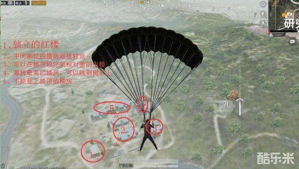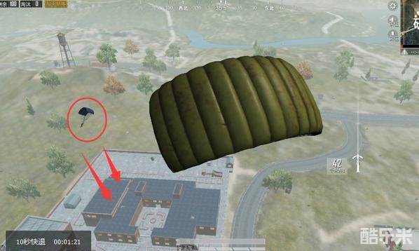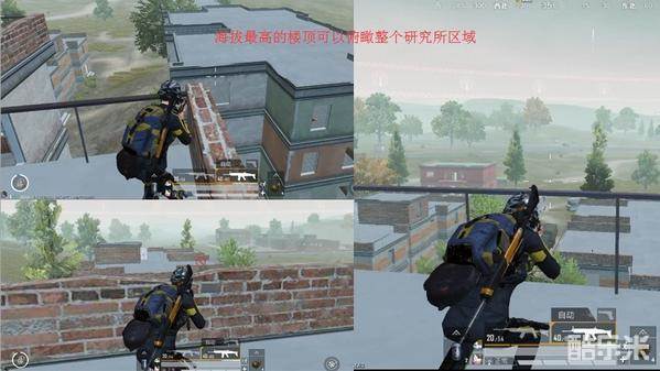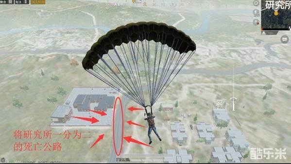 玩家在跳伞的时候,首先要观察周围的其他玩家的情况,尤其是“研究所”主楼区域有多少其他玩家降落。这些竞争者都是自己的潜在威胁。其次,降落时要尽可能保证自己落在“拼图楼”的楼顶,方便第一时间捡取武器观察周围,进行战斗。同时,自己从上向下搜集物资,也不会担心自己背后来人进行偷袭。