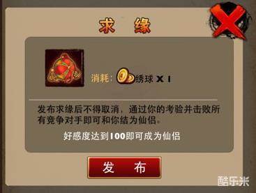 求缘:玩家也可以通过消耗一个绣球,主动发布自己的求缘信息,其他玩家可以通过“相遇”对自己主动发起追求;