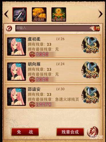 抢夺来的残章可以用来合成功法,点击“残章合成”按扭即可进入合成界面。界面中分显示各种残章的图标和当前玩家所拥有某种残章的数量,当残章数量足够时,点击该残章图标即可合成对就原功法。