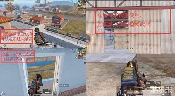 玩家可以考虑,首先降落在北面的仓库位置,优点是可以快速地搜集到枪械,然后利用高地势进行城区观察,开始自己的作战计划。缺点在于,如果仓库和附近的房屋没有刷新出枪械,自己就会陷入“手无寸铁”的尴尬境地,再向城区内部推进就会有被淘汰的风险。