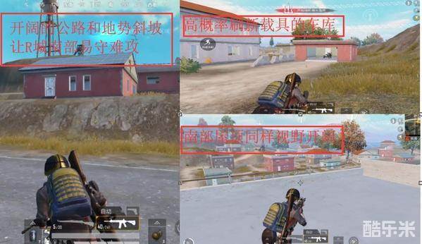 “R城”的南部也是一个不错的降落点位。由于公路的分割和地势较高,这里成为了“R城”的“独立”王国。整体的环境特点是“易守难攻”,通过合理卡位架枪,其他竞争者很难从城区内部主动进攻过来。呈现一竖排的房屋分布也方便玩家搜集物资;南部的高坡和房屋屋顶也给予了玩家良好的观察环境和进攻角度。同时,这里也有一个高概率刷新载具的“车库”。