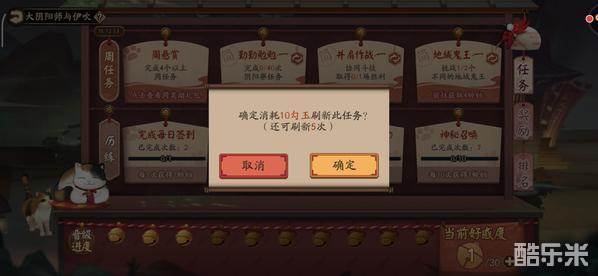 但周任务每周一零点会整体刷新,需要注意,然后点击周的单个任务,可以花费10勾玉进行单个刷新,但仅有5次机会。