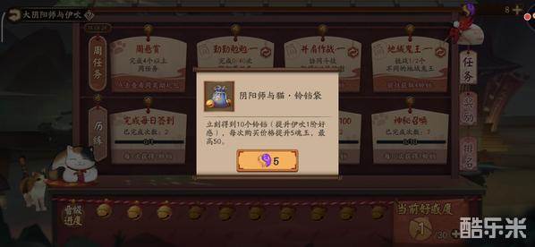 阴阳师与猫·铃铛袋购买后可以获得10个铃铛,其首次价格为5魂玉,每次购买后提升5魂玉,直到最高价50魂玉。