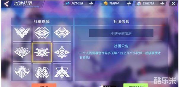 创建社团需要花费300氪晶(还好不是很贵)点击创建社团,选择社团的幸运社徽(证明自己是个社会人)并且输入名称社团创建完毕。