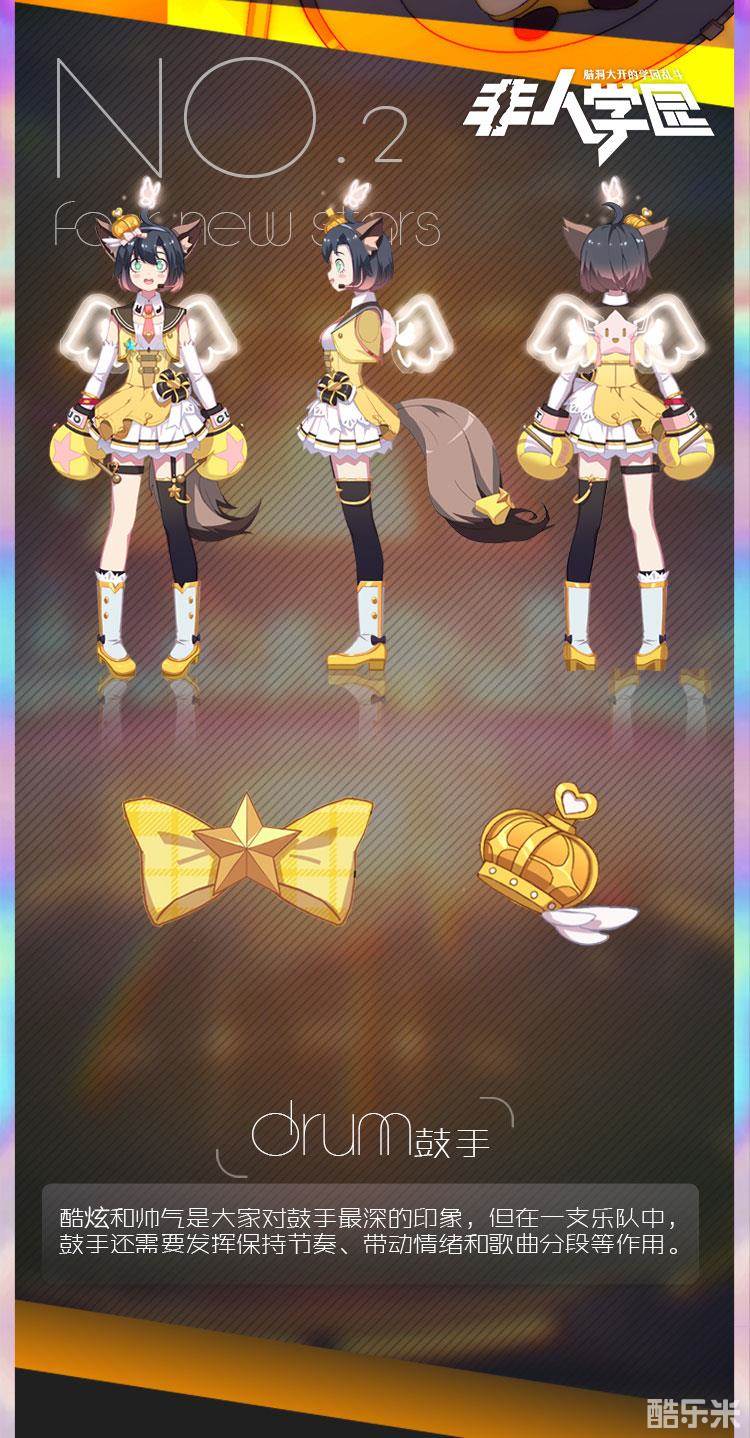 带着梦幻与青春的闪亮色彩,学园专属“少女偶像乐队”正式成立。继主唱狮妹之后,鼓手玉子今天也穿上了偶像时装【DRUM】元气亮相,明黄配色充满了元气感,偶像的气息扑面而来,她将和狮妹一起用躁动的乐音让学园祭尽情嗨翻。