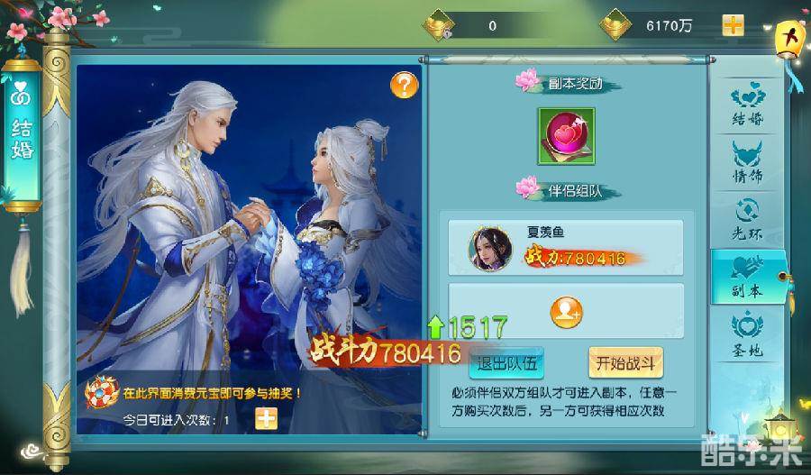 玩法:需要夫妻组队才能进入副本,副本掉落婚戒升级材料,通关可以获得更多材料奖励。夫妻每天有一次进入副本的机会,但是可以花费元宝购买额外次数。