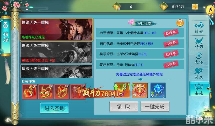 玩法:在圣地可以获得强大的情饰,圣地内设有情缘历练任务,结婚等级越高,任务奖励越高,如果夫妻两人都完成任务,双方可以获得丰厚奖励。每天12点刷新任务。