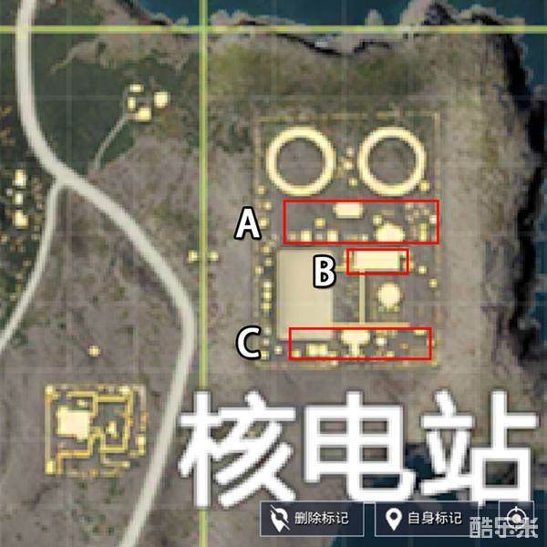 核电站内部算是比较复杂的,除了中间的一栋楼之外都是零散的仓库等等,需要注意的是资源点中的三个巨型建筑。最北边的两个空心大圆桶,还有西边的大池子,这三个建筑占了核电站接近一半的地方,但是这些地方是不刷新资源的。A区域和C区域是被中间建筑物隔开的两块资源区,B区域就是核电站唯一的高楼了,也是核电站的最佳制高点。 二、落地点选择