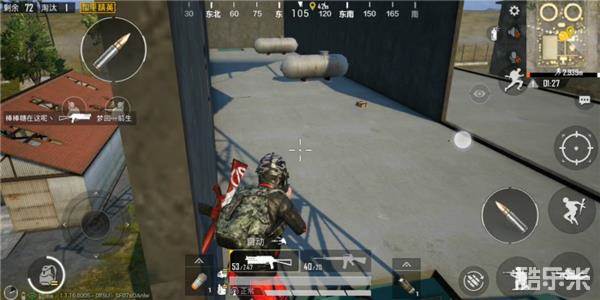 一个是三楼西边的这个残留的墙体,通过攀爬走到顶可以观察到北面的情况,不过这个位置过于危险,需要我们先排除西边的区域是否安全,不过这个位置只能看不能打。所以我们需要用到第二个点位,这个点位就是我们所在建筑物的东边的一个大罐,这里在楼顶可以直接跳过来,建议把枪收起来跳增加成功率。这里有掩体和蛮不错的视野可以帮助我们清理A区域的其他玩家,而且很多玩家并不知道这个点位,也不会想到这里有人,所谓出奇制胜,打他们一个措手不及。