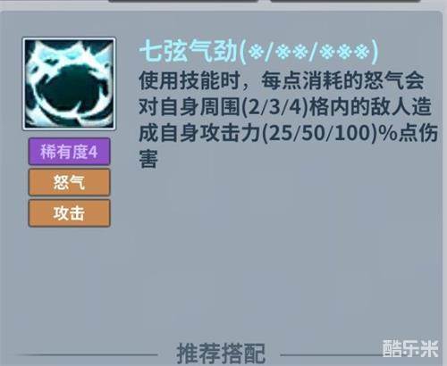 七弦配合第一关送的毒击 、大力出奇迹两个3怒小技能都能打出不错的爆发,中后期配合高怒技能能打出巨额爆发。
