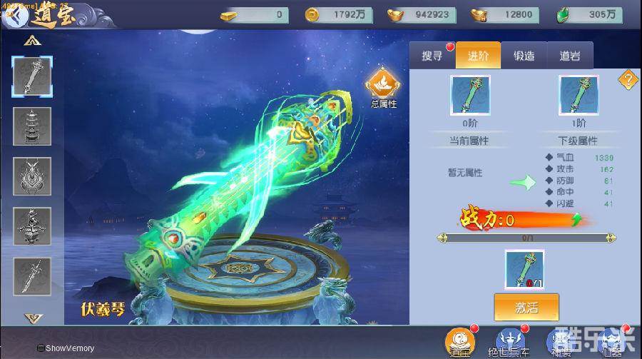 另外,在仙器系统里,还有绝世兵库和道宝两个系统,绝世兵库可以通过铜钱和元宝两种方式抽取,但是铜钱有次数限制,集齐任意一组兵器卡片可提升对应的人物属性,推荐多提升攻击类属性。道宝系统可以通过道宝搜寻收集。