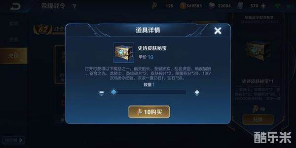 那么问题来了,如何兑换宝箱才是最合理的呢?如果是进阶版的战令,达到80级共470个战令币,优先把积分夺宝的买了,每个30战令币剩余410。10个皮肤碎片,每个10战令币,剩余310。剩下的全部兑换史诗皮肤秘宝,共31个,同时打开,这样获得皮肤的概率很高,小编我就是如此,积攒了大半个赛季的秘宝一起打开,获得了暗夜猫娘。