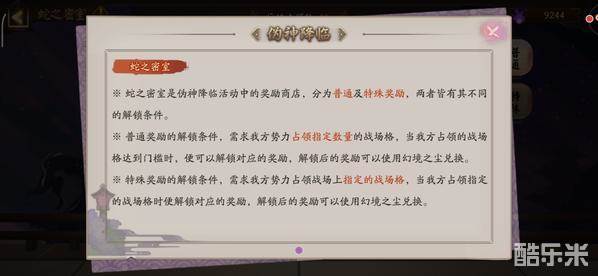 二是活动界面右下角的“蛇之密室”,其为该活动的奖励兑换处,而兑换道具为幻境之尘,具体规则如下:
