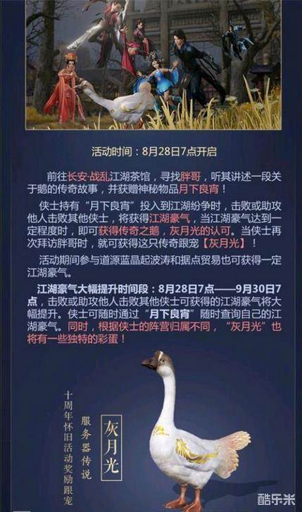 为了纪念一头堪称“服务器传说”的灰鹅。在十周年活动开启后,浩气盟、恶人谷以及中立侠士都可以前往长安·战乱场景的江湖茶馆,寻找江湖奇人“胖哥”,听其讲述一段关于“一头鹅”的传奇故事,并将获赠神秘物品“月下良宵”!