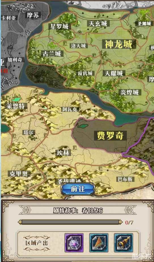 王之大陆由神龙城,费罗奇,巴塞利亚及诺里尔克四大帝国组成,每片区域都有自己的特色及产出。玩家通过的战斗关卡越多,就能解锁产出更丰富的区域。
