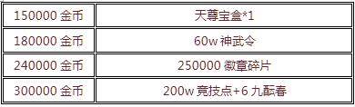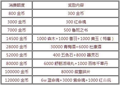 【活动内容】活动期间,游戏内累计消费达到对应金币,即可获得对应奖励;所有商品绝对超值,不信你自己看。相中哪个千万别手软!因为一犹豫也许就不知道何时能再见了。