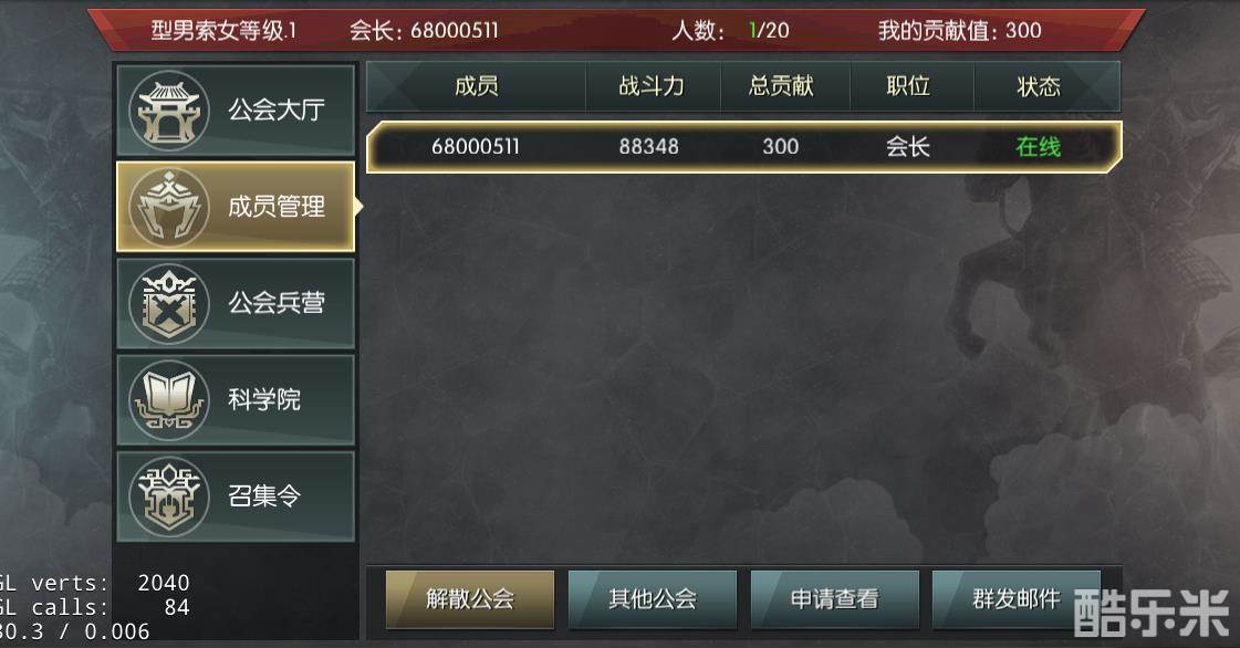 公会成员管理界面可以查看公会成员的战斗力、贡献值、在线情况等,另外在这里也可以给公会成员群发邮件;