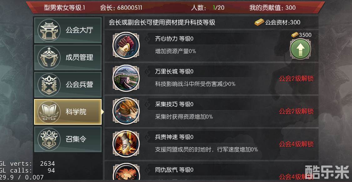 科学院中可以使用公会资材升级公会科技,公会科技可以给公会成员带来各种加成,公会等级越高,可以解锁的公会科技也越多。