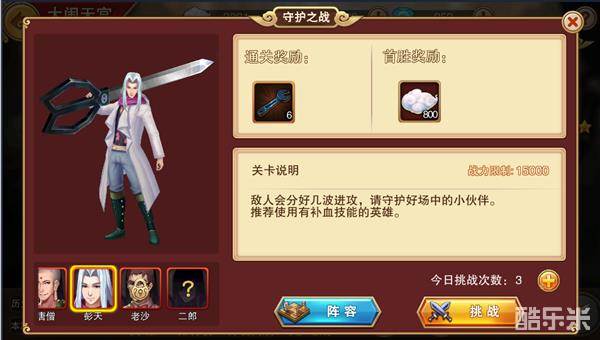 2、每日可挑战次数为3次,另外我们可以通过钻石购买挑战次数。