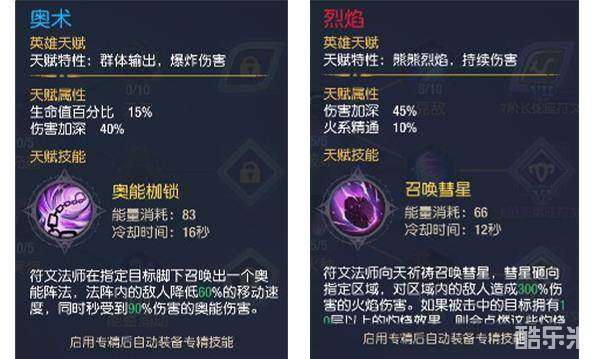 在游戏中同样有两条发展路线,分别为烈焰天赋及奥术天赋,烈焰天赋专注于输出,45%的伤害加深和10%的火系精通,能给敌人造成极高的伤害;奥术天赋40%加深和15%的血量,偏向控制及PVP。