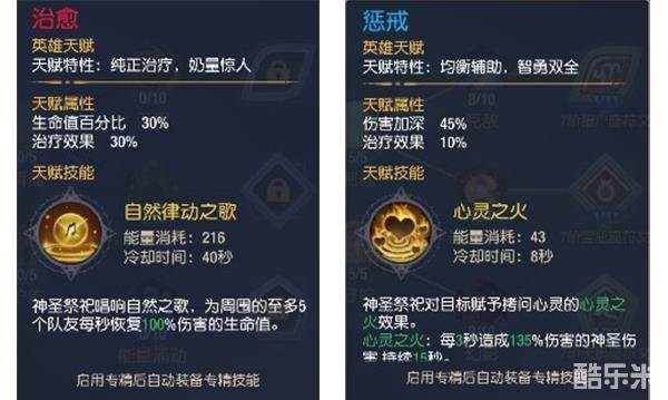在游戏中的两种天赋分别为治疗和惩戒,惩戒增加45%的伤害加深和10%的治疗效果,天赋中的“鼓舞”可以增加团队成员5%的攻击,在输出和治疗都有不错的表现;治疗天赋增加30%的生命和30%的治疗效果,天赋中的“护佑”可以赋予玩家复活其他玩家的能力,是祭司的核心技能。