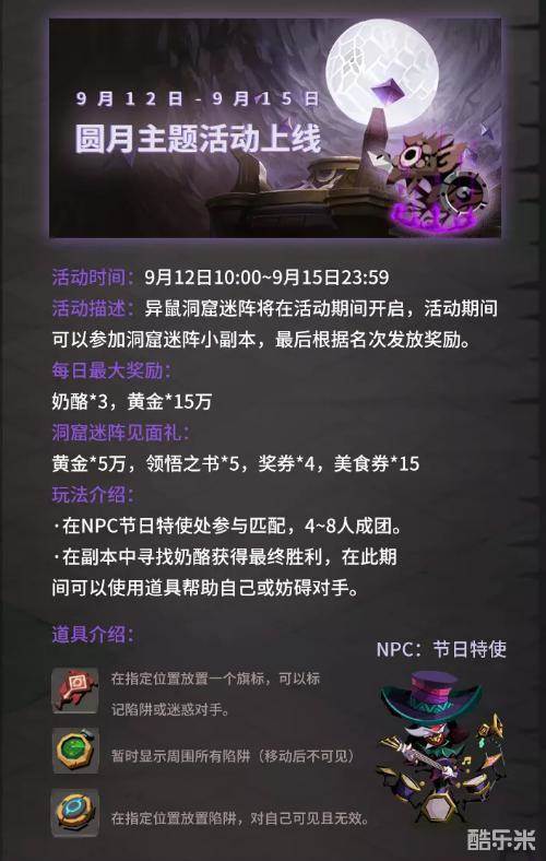 本次中秋节活动中,最具特色和趣味的莫过于“洞窟迷阵”新玩法啦。9月12日至9月15日,“洞窟迷阵”趣味副本限时上线,所有玩家进入活动副本后将变身为“异鼠”,开展一场趣味横生的角逐,还能赢取丰厚的奖励以及活动道具“奶酪”,用于兑换更丰厚的奖励。
