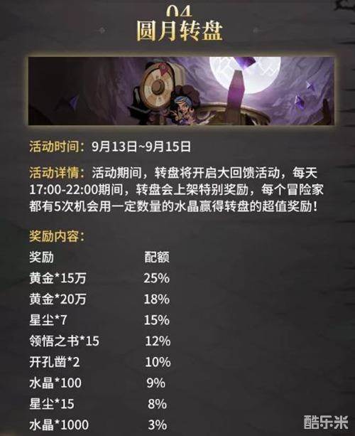 中秋佳节到了,转盘NPC格洛瑞亚也开启了大回馈活动。9月13日至9月15日期间,每天17:00-22:00期间,转盘会上架特别奖励,每个冒险家都有5次机会用一定数量的水晶赢得转盘的超值奖励!