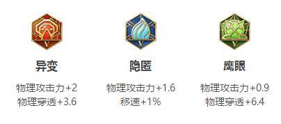 Tips:经典的刺客百穿铭文搭配,因为云中君优先狩猎的目标为后排,可以最大化的利用属性效果