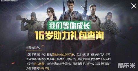 1)16周岁以下的未成年用户,通过强制性的公安实名校验,未满16周岁的用户将不能获得授权,无法登录游戏体验;和平精英也准备了丰富的助力大礼包,待用户年满16周岁,可以进入游戏领取。