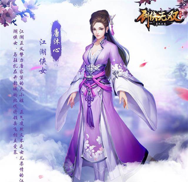 唐沐心是江湖正义势力唐家堡的大小姐,正气凌然又不乏女儿柔情的江湖侠女。虽贵为千金小姐,但唐沐心却正直爽朗,丝毫没有小姐脾气,她虽为女子,但时刻关心国家命运。她与驻扎在开封城的北伐将领岳飞相互爱慕,虽被唐家堡和宗元帅反对,却依然愿意不计名分地跟随岳飞