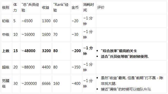 "3"个 2★ (最大 2★)兵员打[经验之间 - 超级] (+ 队友打手) - 一场全部满级, 卖价 15000x4=45000, 收益为: 45000 / 20体 = 2250