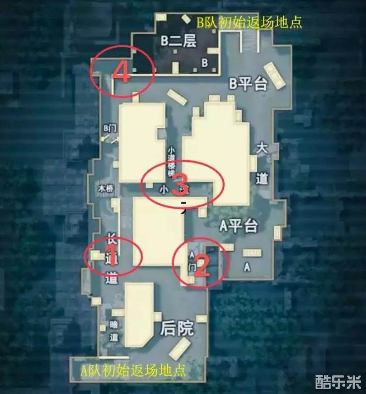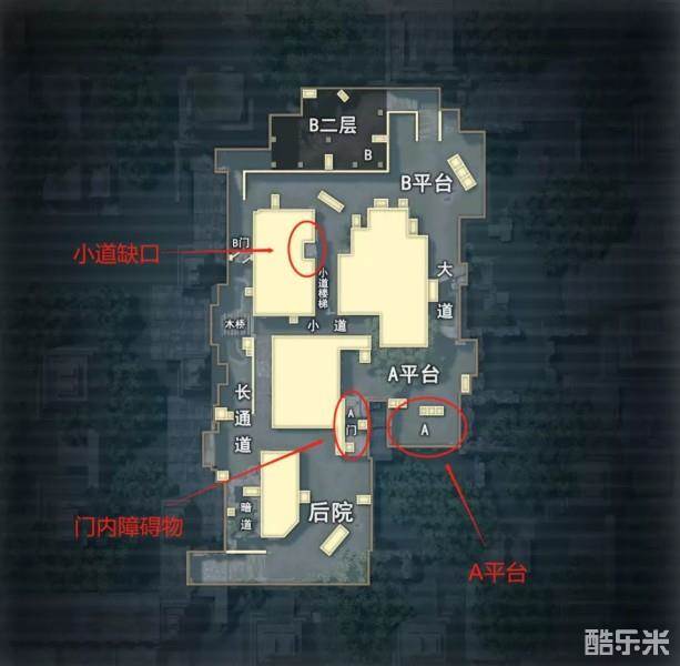 掩体比较多,也是兵家必争之地,出门通过台阶可以上到小道,也可以卡右侧长通道的敌方,进可攻,退可守。门内的障碍物、门外上到小道的缺口、A平台下边的A位置,这些地方需要注意是否有埋伏。