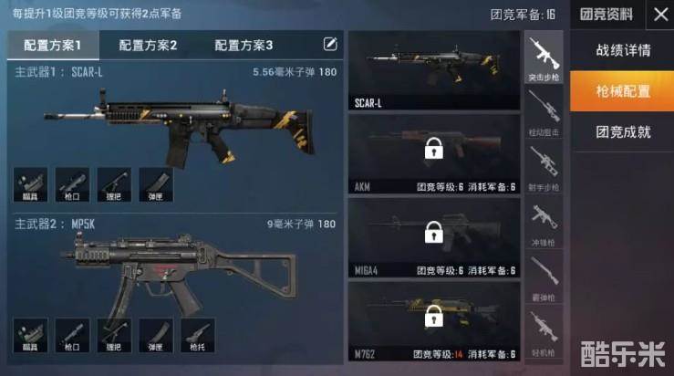 然后点击“枪械配置”,枪械配置中有多种武器可以进行配置。武器需要达到不同的等级才能解锁,拥有更高的团队竞技等级,就有得到更好的枪械。