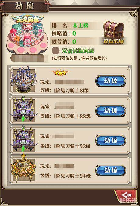 玩家只要点击进入劫掠系统,即可看见系统随机分配的玩家以及玩家的等级。同时亦可以暗中观察你与对手之间的等级差距,点击右侧劫掠按钮即可进入战斗。每次战斗成功后,玩家都可以获得丰富的精炼石奖励。每次劫掠会增加一定的疲劳值,当疲劳值达到100时则不可再进行劫掠。玩家还可以采取双倍奖励挑战模式,在获得双倍奖励的同时,疲劳值亦会相应的双倍增长。在面临敌人侵略的时候,作为斯特尔研究院的一份子,我们就应该奋起还击,与敌人抗争到底。为了王之大陆的光明未来,大家冲鸭!