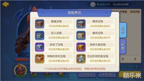 联盟奖励:根据联盟BOSS剩余血量,以及BOSS击杀情况,领取各类宝箱奖励