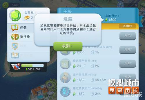 在《模拟城市:我是市长》中,要晋升市长通行证的等阶,需要通过完成市长竞赛任务来赚取水晶点数。从某种角度而言,水晶点数就是提升通行证阶位的经验值。而之前也提到过,通行证阶位越高,玩家可领取的奖励就越多,故而想要获得大把福利,玩家就要挑选适合自己的市长竞赛任务,并努力完成它们。