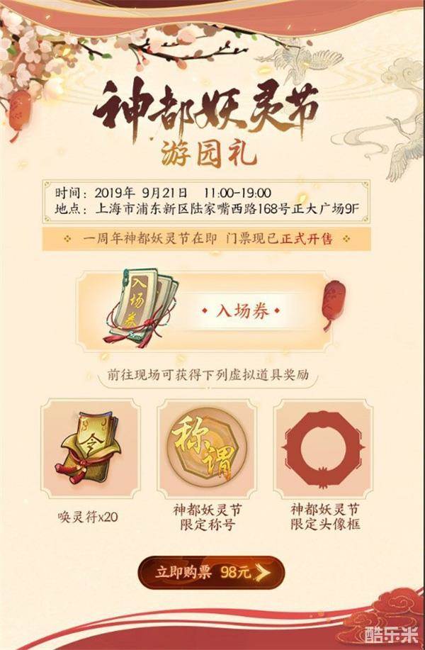 “一周年神都妖灵节”入场券已经在游戏内嵌周边商城以游园礼包形式开售,购买游园礼包后,降妖师可凭快递送达的购买凭证在现场兑换入场券、唤灵符、限定称号和限定头像框,畅享周年狂欢。