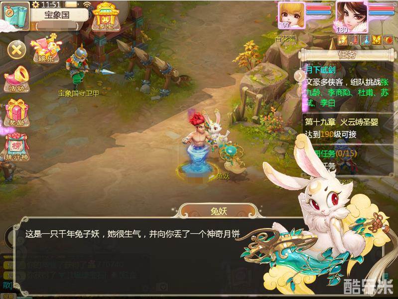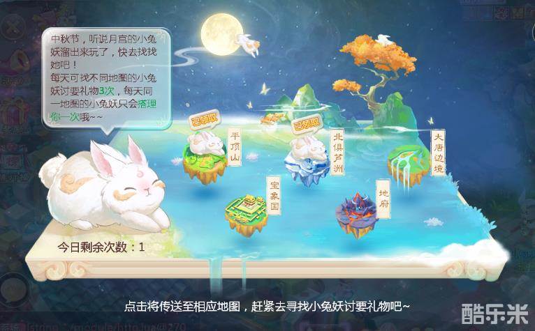 等级≥35级及以上单人可参与“玉兔倩踪”玩法,玩家通过活动页面可以传送至相应地图,寻找到小兔妖之后即可向它讨要礼物!礼物包含经验、1级宝石、伙伴修炼册、高级技能书残卷、属性卡、月华积分等,每个玩家每天可找不同地图的小兔妖讨要礼物三次,但同地图兔妖只会搭理同一玩家一次,敬请注意。