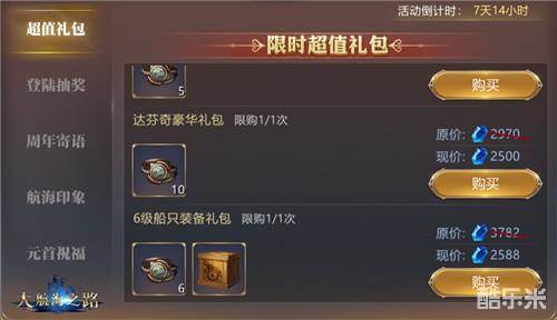 不止如此,周年庆活动期间,船长们还可花费一定蓝钻购买“装备强化部件礼包”,获得总计十个可随机提升人物装备某一属性的装备(每人限购2次),同时,船长还可购买6级船只装备礼包、达芬奇高手礼包等众多超值礼包,更有3周年船只徽章,3周年船只帆染等三周年专属外观道具等你来获取!