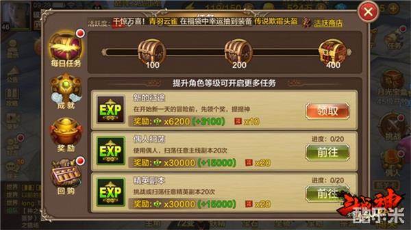 游戏中的每日任务也为玩家们提供了便利的升级方式。其不仅将《全民斗战神》中绝大部分玩法以任务的形式呈现在玩家面前,以便玩家逐个体验。当玩家完成该任务后,还能获得大量经验值和神秘物品奖励。完成每日任务还能奖励给玩家一定数额的活跃度。当玩家的活跃度达到100、200、400时,就会开启活跃度宝箱,活跃度越高,宝箱内含有的经验与活跃比就越多。活跃币主要用于活跃度商店,可兑换珍贵的齐天大圣碎片和种族天赋书等。
