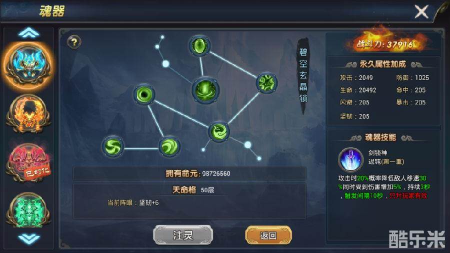 (1)碧空玄晶锁:只要达到28级即可开启,技能剑锁神效果为攻击时20%概率降低敌人移速30%同时受到伤害增加5%,持续3秒,触发间隔10秒,只对玩家有效。