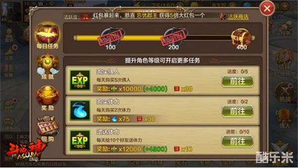 每日任务是《全民斗战神》中经验获取的最重要途径。该系统将游戏中最值得体验的多项玩法集中显示,如试炼之地、神之猎场、组队Boss等。这些任务由游戏精挑细选,不仅玩法十分有趣,还能带给玩家非常丰厚的奖励。