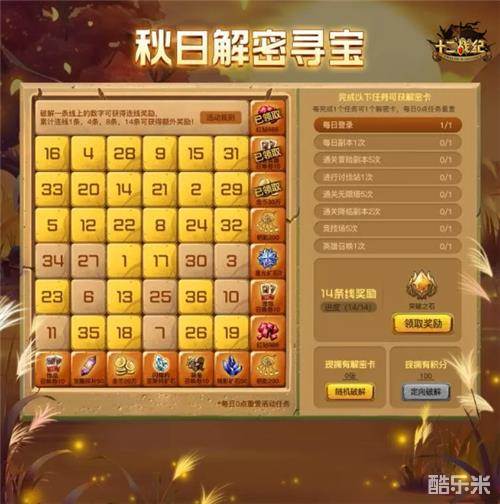 秋日来临,新的庆典活动秋日解密寻宝也已经上线。每次完成日常任务都能够获得解密卡以点亮对应的数字,每点亮一个数字就能够获得一次奖励。最关键的是,当点亮的数字练成一条线时,就能够获得连续奖励,什么觉醒碎片,红钻统统不是事。怎么样,体会到了什么叫乐趣奖励两开花了吗?