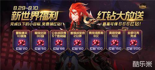随着新学期的开启,咱们《十二战纪》新世界也开始了红钻大放送!冒险的路很长,但《十二战纪》会与你风雨同舟!完成目标免费领取红钻,最高可得666红钻!