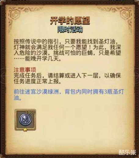新的学期,不知道大家有什么愿望想要实现,我的愿望是能够晚开学几天。如果有相同愿望的冒险者们,快去沙漠绿洲,找到圣灯油,这样灯神就能满足你们的愿望了。