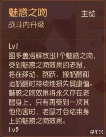 Lv1:“图多盖洛”释放出1个魅惑之吻,受到魅惑之吻效果的老鼠将在移动、跳跃、搬奶酪和运奶酪时持续损失健康值。魅惑之吻效果将永久存在老鼠身上,只有再受到一次其他伤害时,老鼠才会结束效果。