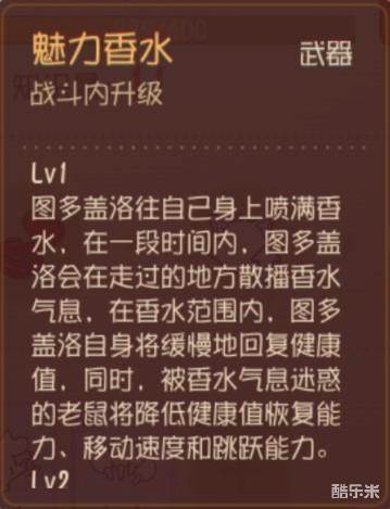 Lv3:增加效果“图多盖洛”在香水范围内攻击冷却时间大幅减少且攻击范围扩大,老鼠在香水范围内无法使用技能。